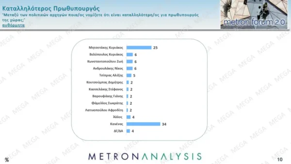 Ο «Κανένας» έχει παγιωθεί ως καταλληλότερος πρωθυπουργός με 34% με τον Κυριάκο Μητσοτάκη να ακολουθεί στο 25%. Από 6% συγκεντρώνουν Νίκος Ανδρουλάκης, Ζωή Κωνσταντοπούλου και Κυριάκος Βελόπουλος. Ο Αλέξης Τσίπρας φθάνει το 5%.