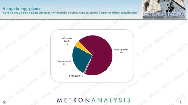 Οι πολίτες εξακολουθούν να έχουν παγιωμένη αντίληψη ότι η χώρα πορεύεται σε λάθος κατεύθυνση σε ποσοστό 69%.