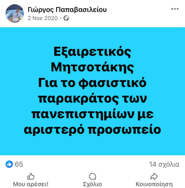 Συγκεκριμένα ο κ. Παπαβασιλείου τον Νοέμβριο του 2020 και με αφορμή περιστατικά βίας σε πανεπιστήμια έγραφε: «Εξαιρετικός Μητσοτάκης, για το φασιστικό παρακράτος των πανεπιστημίων με αριστερό προσωπείο».
