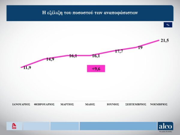 ALCO: Στις 11,6 μονάδες το προβάδισμα της ΝΔ, αύξηση των αναποφάσιστων στο 21,5%