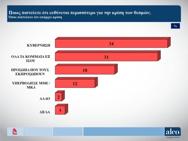 Ποιος έχει την ευθύνη για την κρίση θεσμών; Το 34% λέει η κυβέρνηση, ενώ «όλα τα κόμματα» θεωρεί πως φταίνε το 31%.