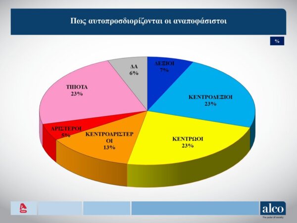 Από τους αναποφάσιστους, οι περισσότεροι είναι μοιρασμένοι μεταξύ κεντρώων και κεντροδεξιών (από 23% έκαστος), ενώ άλλο ένα 23% δηλώνει ότι δεν προσδιορίζει κάπου τον εαυτό του. Στο 13% είναι οι κεντροαριστεροί.