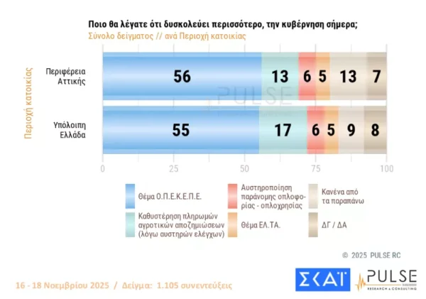 Η ακρίβεια δείχνει να παραμένει στην πρώτη θέση των προβλημάτων που απασχολούν τους Έλληνες πολίτες, καθώς το κόστος ζωής συνεχίζει να αυξάνεται. Η δημοσκόπηση της Pulse έδειξε επίσης ότι οι πολίτες θεωρούν σε ποσοστό 56% πως η κυβέρνηση αντιμετωπίζει δυσκολίες στο θέμα του ΟΠΕΚΕΠΕ, το οποίο βέβαια, συνδέεται με το 15% των καθυστερήσεων στις πληρωμές των αγροτών.
