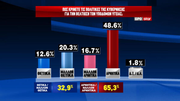 Το 65,3% κρίνει αρνητικά και μάλλον αρνητικά τις πολιτικές της κυβέρνησης για τη βελτίωση των υποδομών Υγείας.