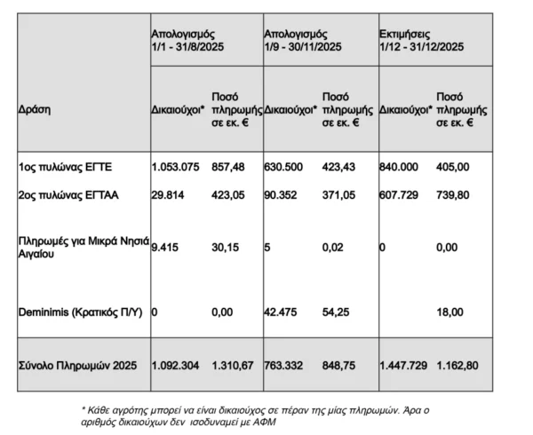 «Κατά το διάστημα από 1η Ιανουαρίου έως 31 Δεκεμβρίου 2025 προβλέπεται ότι θα έχουν καταβληθεί στους αγρότες 3,8 δις ευρώ από τον ΟΠΕΚΕΠΕ, τον Κρατικό Προϋπολογισμό και τον ΕΛΓΑ. Μέχρι σήμερα έχουν πληρωθεί στους αγρότες 2,6 δις ευρώ και μέχρι τέλος Δεκεμβρίου θα πληρωθεί επίσης 1,2 δις ευρώ, ανακοίνωσε το υπουργείο Αγροτικής Ανάπτυξης μετά το τέλος της ενημέρωσης του υπουργού Κώστα Τσιάρα προς τους βουλευτές της Νέας Δημοκρατίας.
