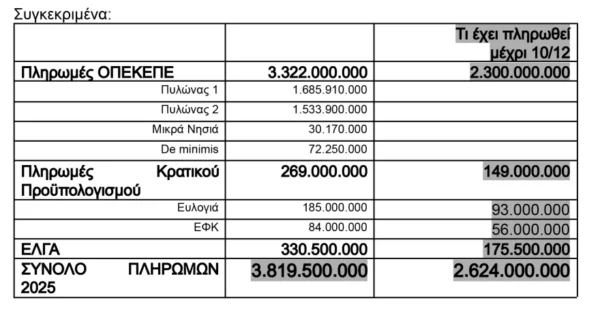 «Κατά το διάστημα από 1η Ιανουαρίου έως 31 Δεκεμβρίου 2025 προβλέπεται ότι θα έχουν καταβληθεί στους αγρότες 3,8 δις ευρώ από τον ΟΠΕΚΕΠΕ, τον Κρατικό Προϋπολογισμό και τον ΕΛΓΑ. Μέχρι σήμερα έχουν πληρωθεί στους αγρότες 2,6 δις ευρώ και μέχρι τέλος Δεκεμβρίου θα πληρωθεί επίσης 1,2 δις ευρώ, ανακοίνωσε το υπουργείο Αγροτικής Ανάπτυξης μετά το τέλος της ενημέρωσης του υπουργού Κώστα Τσιάρα προς τους βουλευτές της Νέας Δημοκρατίας.