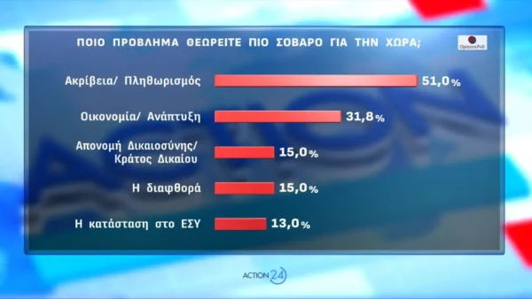 Στο ερώτημα για το ποιο πρόβλημα θεωρείτε πως σοβαρό για τη χώρα το 51% λέει ακρίβεια/πληθωρισμός, το 31% οικονομία/ανάπτυξη το 15% απονομή δικαιοσύνης/κράτος δικαίου, το 15% η διαφθορά, το 13% η κατάσταση στο ΕΣΥ.