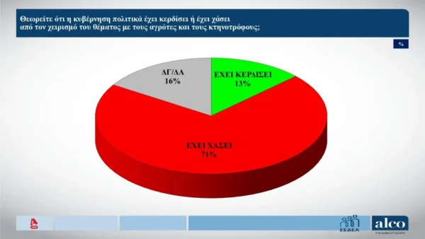 Τέλος οι πολίτες θεωρούν σε ποσοστό 71% πως η κυβέρνηση έχει χάσει στο θέμα των αγροτών και των κτηνοτρόφων αναφορικά με τους χειρισμούς της.