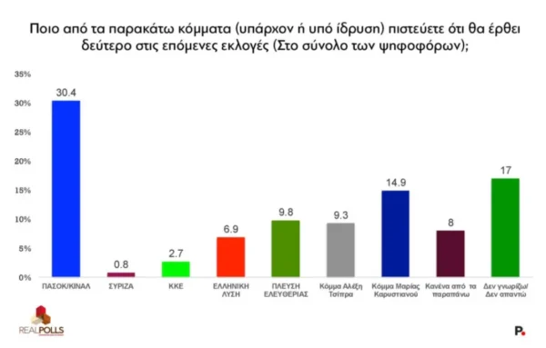 - Δημοσκόπηση RealPolls: Μεγάλο προβάδισμα της ΝΔ, μάχη ΠΑΣΟΚ με Πλεύση για τη δεύτερη θέση – “Ξεφουσκώνει” η Καρυστιανού