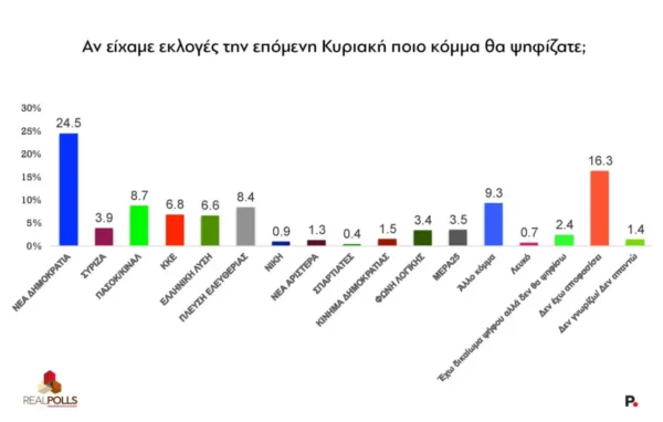 Δημοσκόπηση RealPolls: Μεγάλο προβάδισμα της ΝΔ, μάχη ΠΑΣΟΚ με Πλεύση για τη δεύτερη θέση – “Ξεφουσκώνει” η Καρυστιανού