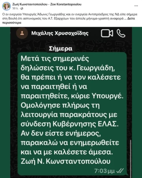 Η Ζωή Κωνσταντοπούλου έδωσε στη δημοσιότητα μήνυμα που απέστειλε στον υπουργός Προστασίας του Πολίτη, Μιχάλη Χρυσοχοίδη, επειδή όπως κατήγγειλε αστυνομικός από το ΑΤ Εξαρχείων ενημέρωσε τον Άδωνι Γεωργιάδη για την μήνυση που είχε καταθέσει σε βάρος του, παραβιάζοντας το απόρρητο και τη νομιμότητα.