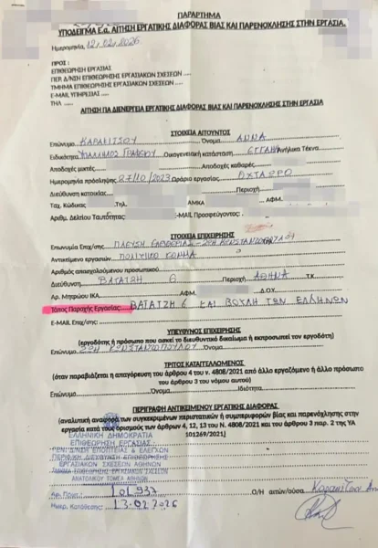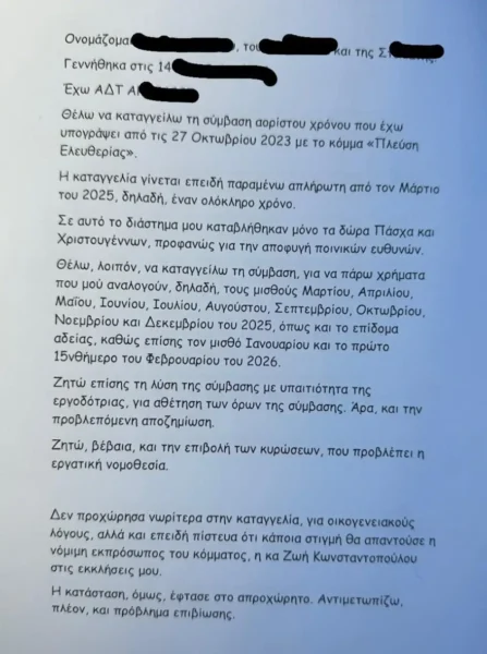 Η καταγγελία της υπαλλήλου της Πλεύσης Ελευθερίας στην Επιθεώρηση Εργασίας
