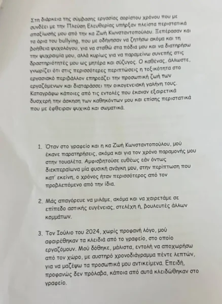 Καταγγελία στην Επιθεώρηση Εργασίας σε βάρος της Ζωής Κωνσταντοπούλου, υπέβαλε η Άννα Καρακίτσου, εργαζόμενη του κόμματος Πλεύση Ελευθερίας με σύμβαση αορίστου χρόνου από τις 27 Οκτωβρίου 2023, αποδίδοντας στην εργοδότρια –όπως αναφέρει– «ηθική παρενόχληση», «εξευτελιστική συμπεριφορά» στον χώρο εργασίας και μη καταβολή δεδουλευμένων.