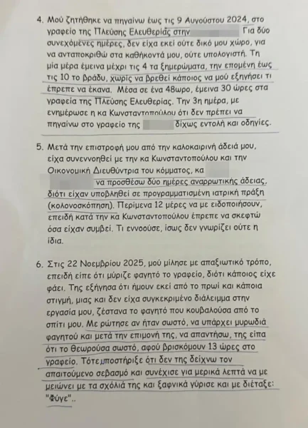 Η Άννα Καρακίτσου, κατά τις ίδιες πληροφορίες, καταγράφει ακόμη εξαντλητικά ωράρια, λέγοντας ότι παρέμεινε έως και 30 ώρες σε διάστημα 48 ωρών στα γραφεία, ενώ κάνει λόγο και για πρακτικές «αυστηρού ελέγχου», όπως αίτημα να ανοίξει προσωπική της σακούλα πριν αποχωρήσει. Σε άλλο σημείο της καταγγελίας της, υποστηρίζει ότι η ψυχολογική πίεση την οδήγησε να ζητήσει βοήθεια από ψυχολόγο, ενώ αναφέρει ότι της υπενθυμιζόταν πως η πρόσληψή της έγινε κατόπιν επιθυμίας συγγενικού προσώπου (η ίδια είναι σύζυγος του αδελφού της βουλευτού της Πλεύσης, Τζώρτζιας Κεφαλά).