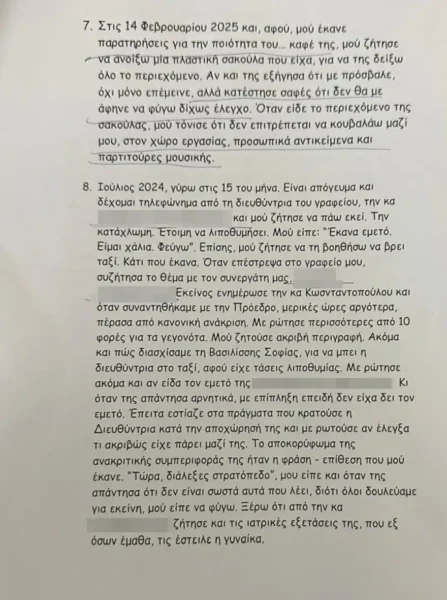 Σύμφωνα με όσα περιγράφει στην καταγγελία της, κατά τη διάρκεια της απασχόλησής της φέρεται να υπέστη επανειλημμένα περιστατικά απαξιωτικής και ελεγκτικής συμπεριφοράς από την πρόεδρο της Πλεύσης Ελευθερίας Ζωή Κωνσταντοπούλου, με παρατηρήσεις ακόμη και για τον χρόνο παραμονής της… στην τουαλέτα, καθώς και περιορισμούς στις επαφές της με στελέχη άλλων κομμάτων. Σύμφωνα με την εκπομπή «Αποκαλύψεις» του ΑΝΤ1, αναφέρει επίσης περιστατικά όπως αφαίρεση κλειδιών του γραφείου, αλλά και απαίτηση να αποχωρήσει σε σύντομο χρονικό περιθώριο, συγκεντρώνοντας τα προσωπικά της αντικείμενα.
