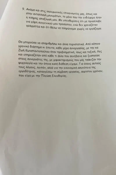 - Ζωή Κωνσταντοπούλου: Εργαζόμενη καταγγέλλει την πρόεδρο της Πλεύσης Ελευθερίας για απλήρωτους μισθούς και εργασιακό μπούλινγκ
