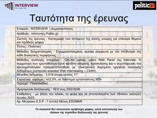Στο 31,6% μετρά τη Νέα Δημοκρατία στην εκτίμηση εκλογικού αποτελέσματος η δημοσκόπηση της Interview για την ιστοσελίδα Politic.gr, με τον Κυριάκο Μητσοτάκη να επιλέγεται ξανά ως ο καταλληλότερος για πρωθυπουργός και τον Αλέξη Τσίπρα να προσπερνά τη Μαρία Καρυστιανού στο ερώτημα πόσο πιθανό είναι να αλλάζατε την επιλογής σας υπέρ ή ενός κόμματος του πρώην πρωθυπουργού ή ενός κόμματος της πρώην προέδρου του συλλόγου των θυμάτων από τα Τέμπη.