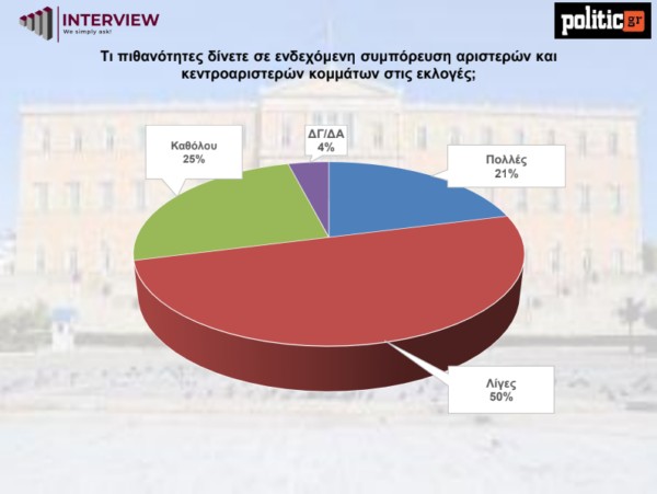 Η πιθανότητα σύμπραξης αριστερών και κεντροαριστερών κομμάτων θεωρείται περιορισμένη. Το 21% τη θεωρεί πιθανή, το 50% τη χαρακτηρίζει μικρή και το 25% ανύπαρκτη. Η εικόνα αυτή ενισχύει την αίσθηση αδυναμίας συγκρότησης εναλλακτικής κυβερνητικής πρότασης απέναντι στη ΝΔ.