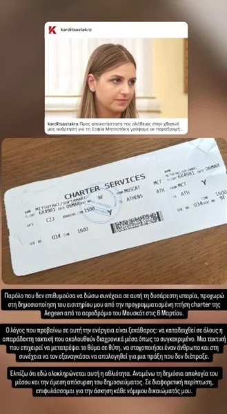 «Παρόλο που δεν επιθυμούσα να δώσω συνέχεια σε αυτή τη δυσάρεστη ιστορία, προχωρώ στη δημοσιοποίηση του εισιτηρίου μου από την προγραμματισμένη πτήση charter της Aegean από το αεροδρόμιο του Μουσκάτ στις 6 Μαρτίου.
