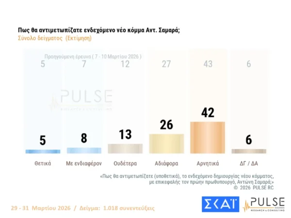 Για το ενδεχόμενο νέου κόμματος από τον Αντώνη Σαμαρά το 42% εκφράζεται αρνητικά, το 26% αδιάφορα, το 13% ουδέτερα, το 8% με ενδιαφέρον και το 5% θετικά.