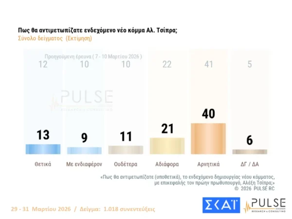 Δημοσκόπηση Pulse: Στις 16,5 μονάδες η διαφορά ΝΔ –ΠΑΣΟΚ , στασιμότητα για Τσίπρα – Καρυστιανού, εντείνεται η ανησυχία για τον πόλεμο
