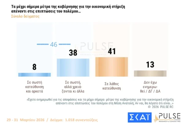 Σύμφωνα με τα ευρήματα της έρευνας, οι πολίτες θεωρούν ότι τα μέτρα που έλαβε η κυβέρνηση για τις συνέπειες του πολέμου στο Ιράν είναι προς τη σωστή κατεύθυνση, δεν είναι, ωστόσο, επαρκή για να καλύψουν τη σημαντική επιβάρυνση στον οικογενειακό προϋπολογισμό.