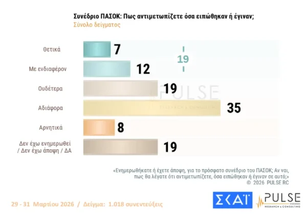 Η έρευνα της Pulse κατέγραψε και την ανταπόκριση-αντίδραση των ψηφοφόρων μετά το συνέδριο του ΠΑΣΟΚ. Αναφορικά με το Συνέδριο του ΠΑΣΟΚ το 35% λέει πως το αντιμετωπίζει αδιάφορα, το 19% ουδέτερα, το 12% με ενδιαφέρον, το 8% αρνητικά και το 7% θετικά.