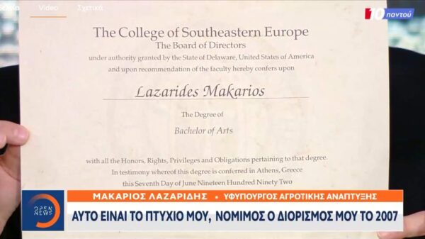 Με το πτυχίο του στα χέρια και με φωτογραφίες από το campus του κολλεγίου του Southeastern Europe προσήλθε σήμερα στα στούντιο του OPEN ο υφυπουργός Αγροτικής Ανάπτυξης Μακάριος Λαζαρίδης μετά το θόρυβο ότι δεν διαθέτει Πανεπιστημιακό πτυχίο για τον διορισμό του σε θέση επιστημονικού συμβούλου στο δημόσιο.