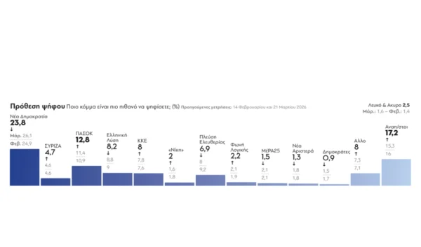 Δημοσκόπηση της GPO για τα Παραπολιτικά καταγράφει πτώση στο 23,8% για τη ΝΔ, που βρίσκεται στο χαμηλότερο σημείο του 2026, άνοδο του ΠΑΣΟΚ και αύξηση των αναποφάσιστων, εν μέσω πολιτικών πιέσεων από την υπόθεση ΟΠΕΚΕΠΕ