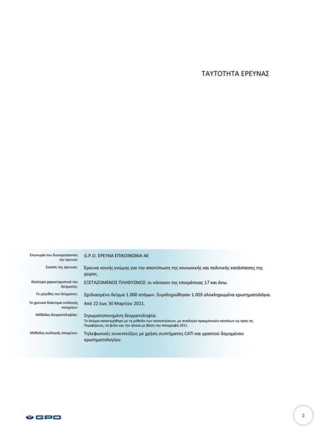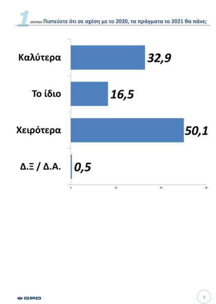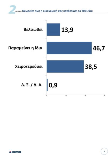 Το 38,5% των ερωτηθέντων θεωρεί ότι η οικονομική του κατάσταση θα χειροτερεύσει μέσα στο 2021, ενώ μόλις το 13,9% πιστεύει ότι θα καλυτερέψει. Η πλειοψηφία πάντως, σε ποσοστό 46,7%, να εκτιμά ότι η οικονομική του κατάσταση «θα παραμείνει ίδια».