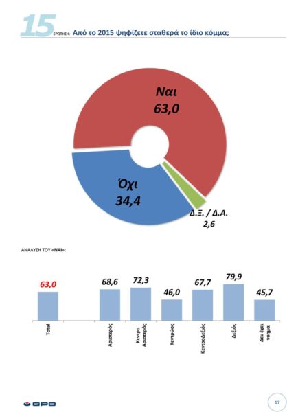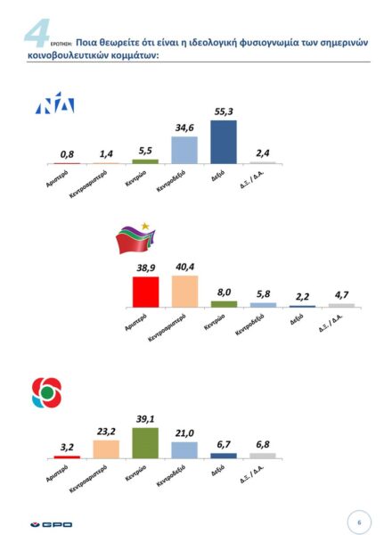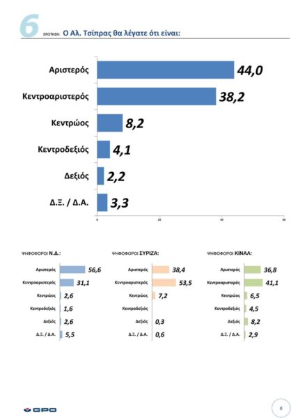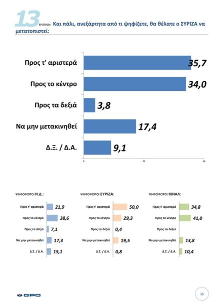 Σημειώνεται ότι ένας στους δύο ψηφοφόρους του ΣΥΡΙΖΑ ζητούν «αριστερή στροφή» από το κόμμα τους και λιγότεροι από το 30% «στροφή στο Κέντρο».