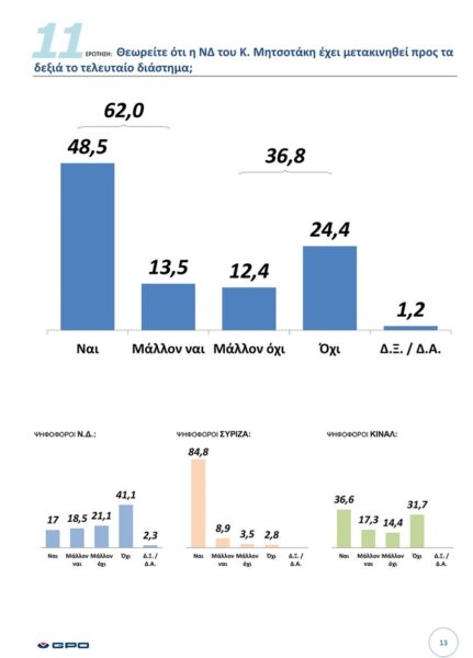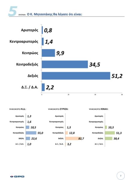 Από την άλλη, ο Κυριάκος Μητσοτάκης θεωρείται «κεντρώος» από σχεδόν έναν στους 5 ψηφοφόρους της Νέας Δημοκρατίας και από έναν στους δέκα ψηφοφόρους του Κινήματος Αλλαγής. Θεωρείται «κεντροδεξιός» από το 55% των ψηφοφόρων της ΝΔ, όπως και από το 51,3% των ψηφοφόρων του Κινήματος Αλλαγής. Ακόμα και ένα ποσοστό 14,1% των ψηφοφόρων του ΣΥΡΙΖΑ, θεωρεί τον κ. Μητσοτάκη «κεντροδεξιό» ή «κεντρώο».
