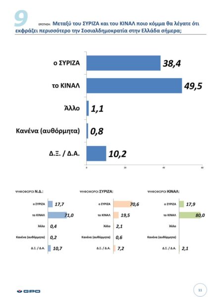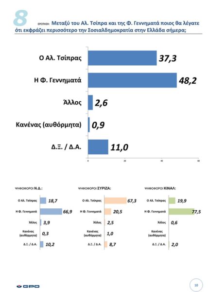 Η Φώφη Γεννηματά κυριαρχεί καθαρά με 48,2% με 37,3% απέναντι στον Αλέξη Τσίπρα στην ερώτηση ποιος εκφράζει περισσότερο τον χώρο της σοσιαλδημοκρατίας, ενώ το ίδιο καταγράφεται και μεταξύ ΚΙΝΑΛ και ΣΥΡΙΖΑ.