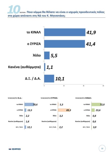 Στην ερώτηση για το «ποιο από τα δύο κόμματα θα θέλατε να είναι ο ισχυρός πόλος στη χώρα απέναντι στη ΝΔ του κ. Μητσοτάκη», το 49,1% απαντά «το ΚΙΝΑΛ και το 41,4 «ο ΣΥΡΙΖΑ». Φυσικά, το ποσοστό του ΚΙΝΑΛ πριμδοτείται από τους ψηφοφόρους της ΝΔ , που το επιλέγουν σε ποσοστό 70,6%. Ωστόσο καταγράφεται και ένα ποσοστό 5,3% ψηφοφόρων του ΣΥΡΙΖΑ που επιλέγουν το ΚΙΝΑΛ, όπως και ένα ποσοστό 23,6% ψηφοφόρων του ΚΙΝΑΛ που επιλέγουν τον ΣΥΡΙΖΑ ως «ισχυρό προοδευτικό πόλο».