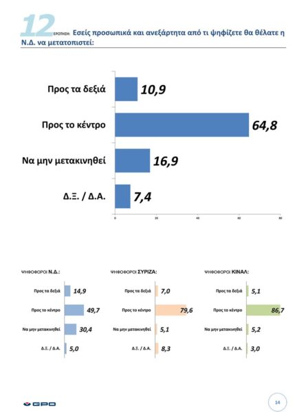 Αντίθετα, το κυρίαρχο αίτημα των ψηφοφόρων του Κινήματος Αλλαγής είναι στροφή προς το Κέντρο (58,8%) , ενώ προς τα αριστερά κοιτάζει μόλις το 21,8%.