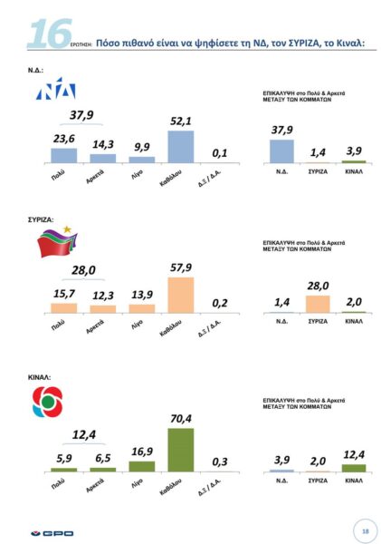 Η Φώφη Γεννηματά έχει τα μεγαλύτερα κέρδη για το κόμμα της, αφού ένα 12,4% των ψηφοφόρων δηλώνουν ως «πολύ» ή «αρκετά» πιθανό να το ψηφίσουν στο μέλλον. Το Κίνημα Αλλαγής είναι το μόνο που στην ερώτηση αυτή έχει μία άνοδο 4 μονάδων σε σχέση με το εκλογικό αποτέλεσμα του 2019, με τη ΝΔ να χάνει 2 μονάδες και τον ΣΥΡΙΖΑ 4 μονάδες.