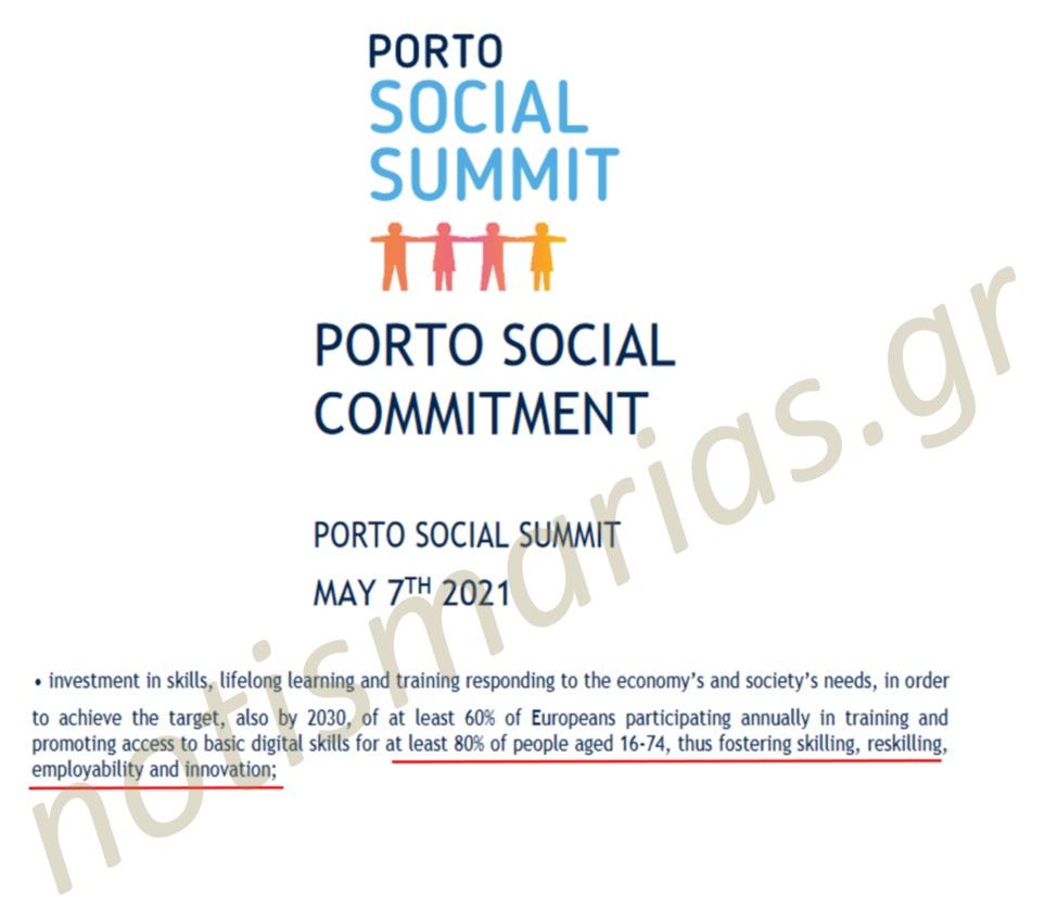 Το πρώτο κείμενο, δηλαδή η «Κοινωνική Δέσμευση του Πόρτο» την οποία υιοθέτησε στις 7/5/2021 η Κοινωνική Διάσκεψη του Πόρτο αναφέρει επί λέξει ότι στηρίζει την «προώθηση της πρόσβασης σε βασικές ψηφιακές δεξιότητες για τουλάχιστον το 80% των ατόμων ηλικίας 16-74 ετών, ενισχύοντας έτσι τις δεξιότητες, την εκ νέου απόκτηση δεξιοτήτων, την απασχολησιμότητα και την καινοτομία».