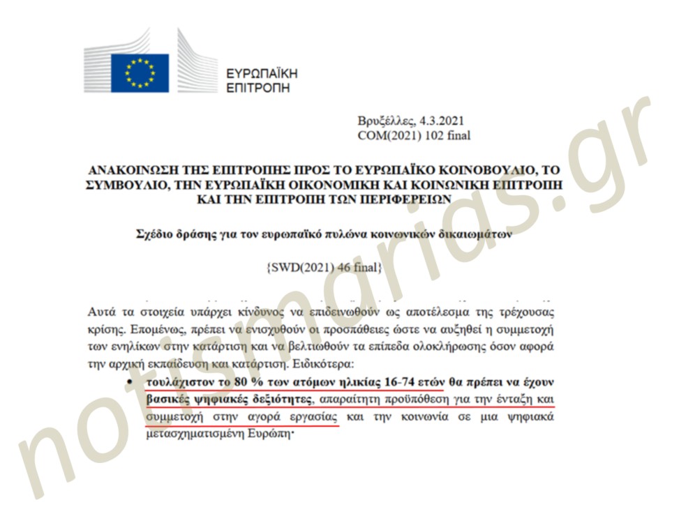 Το δεύτερο κείμενο, δηλαδή το Σχέδιο δράσης της Επιτροπής που υιοθετήθηκε στις 4/3/2021 επίσης καθορίζει ότι «τουλάχιστον το 80% των ατόμων ηλικίας 16-74 ετών θα πρέπει να έχουν βασικές ψηφιακές δεξιότητες, απαραίτητη προϋπόθεση για την ένταξη και συμμετοχή στην αγορά εργασίας και την κοινωνία σε μια ψηφιακά μετασχηματισμένη Ευρώπη».