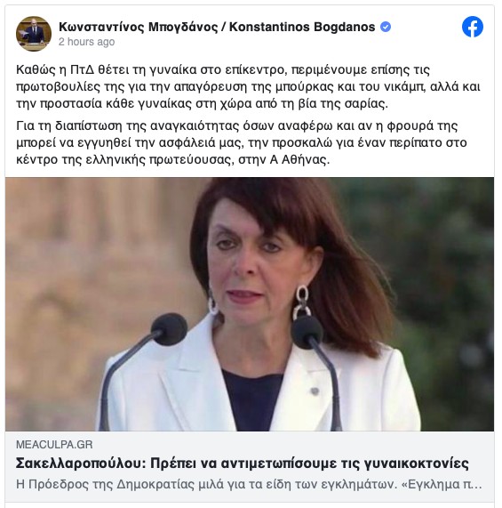 Ο βουλευτής ανήρτησε στο facebook, το σχόλιο του αναφορικά με την παρέμβαση της Κατερίνας Σακελλαροπούλου περί γυναικοκτονιών στην εφημερίδα Τα Νέα.