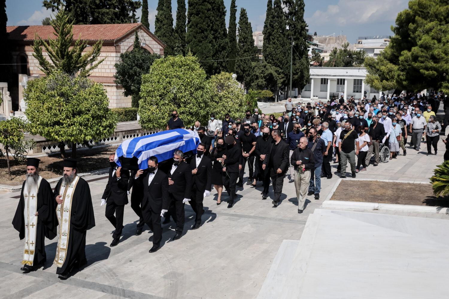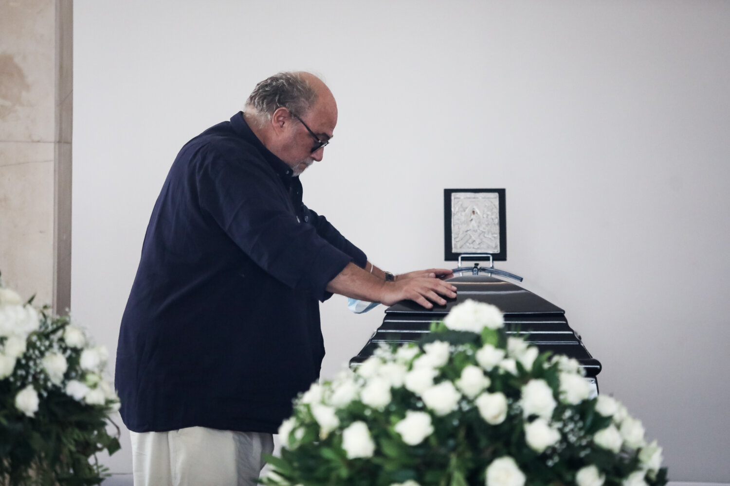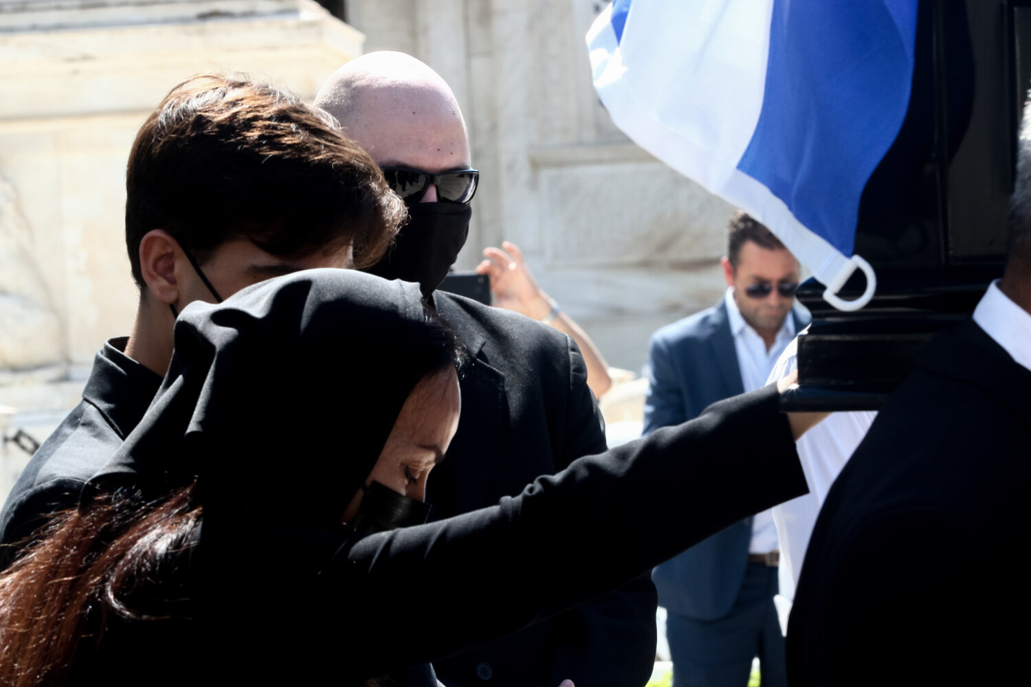 Συντετριμμένη η σύζυγός του Βίκυ Σταμάτη, η οποία λύγισε μπροστά στο φέρετρο, το οποίο καλύφθηκε με την ελληνική σημαία, αλλά και με αυτή του ΠΑΣΟΚ.