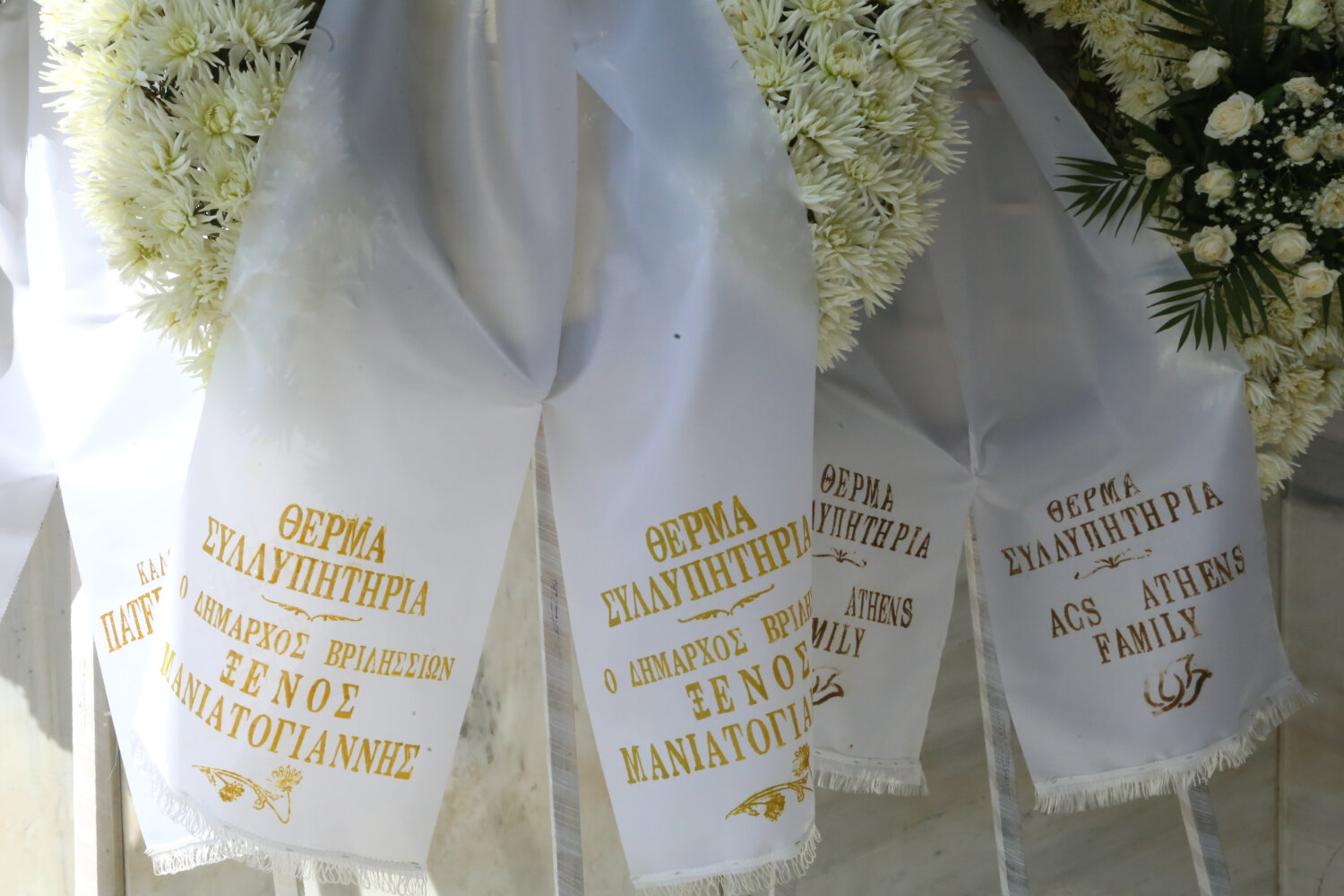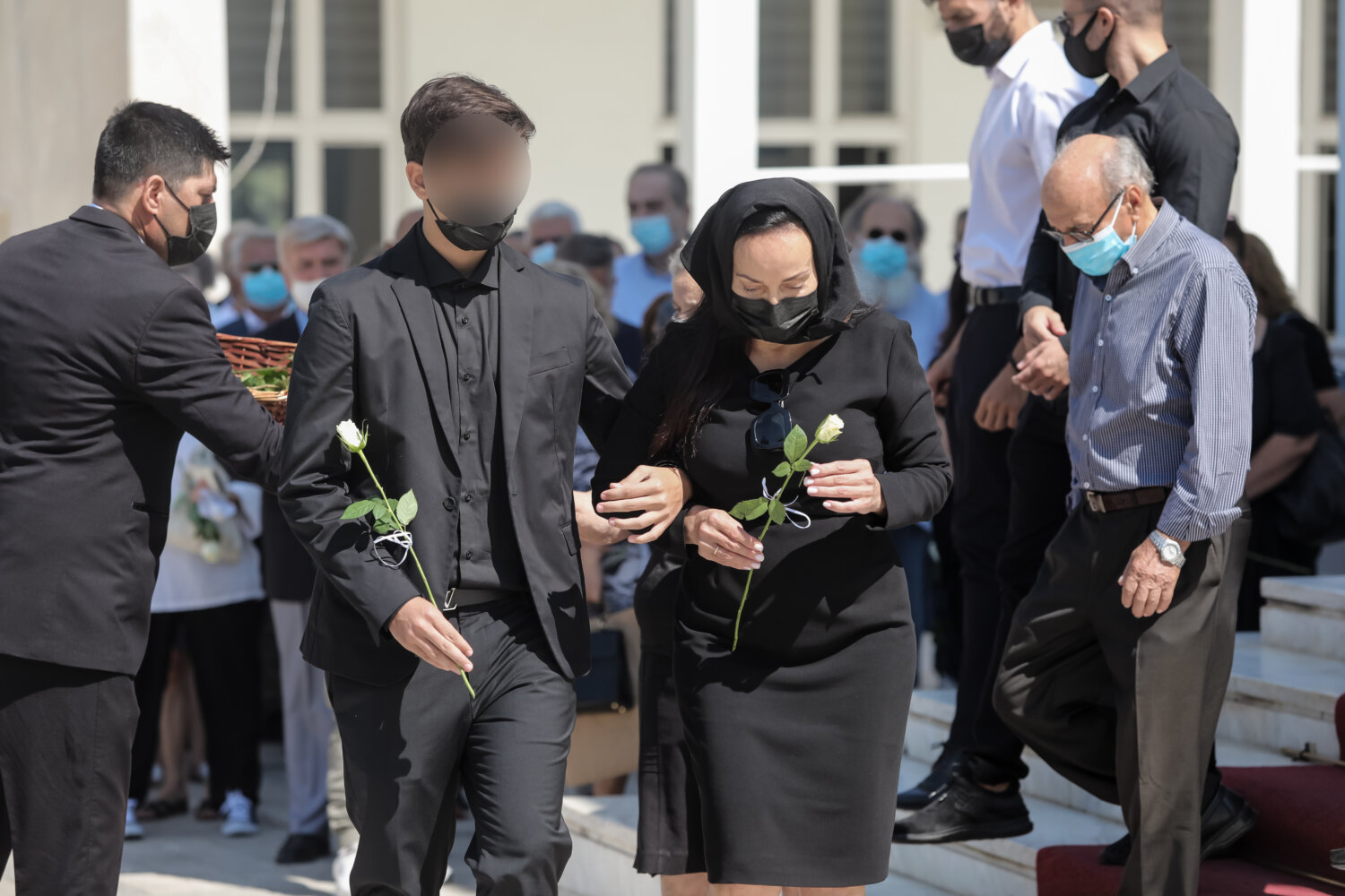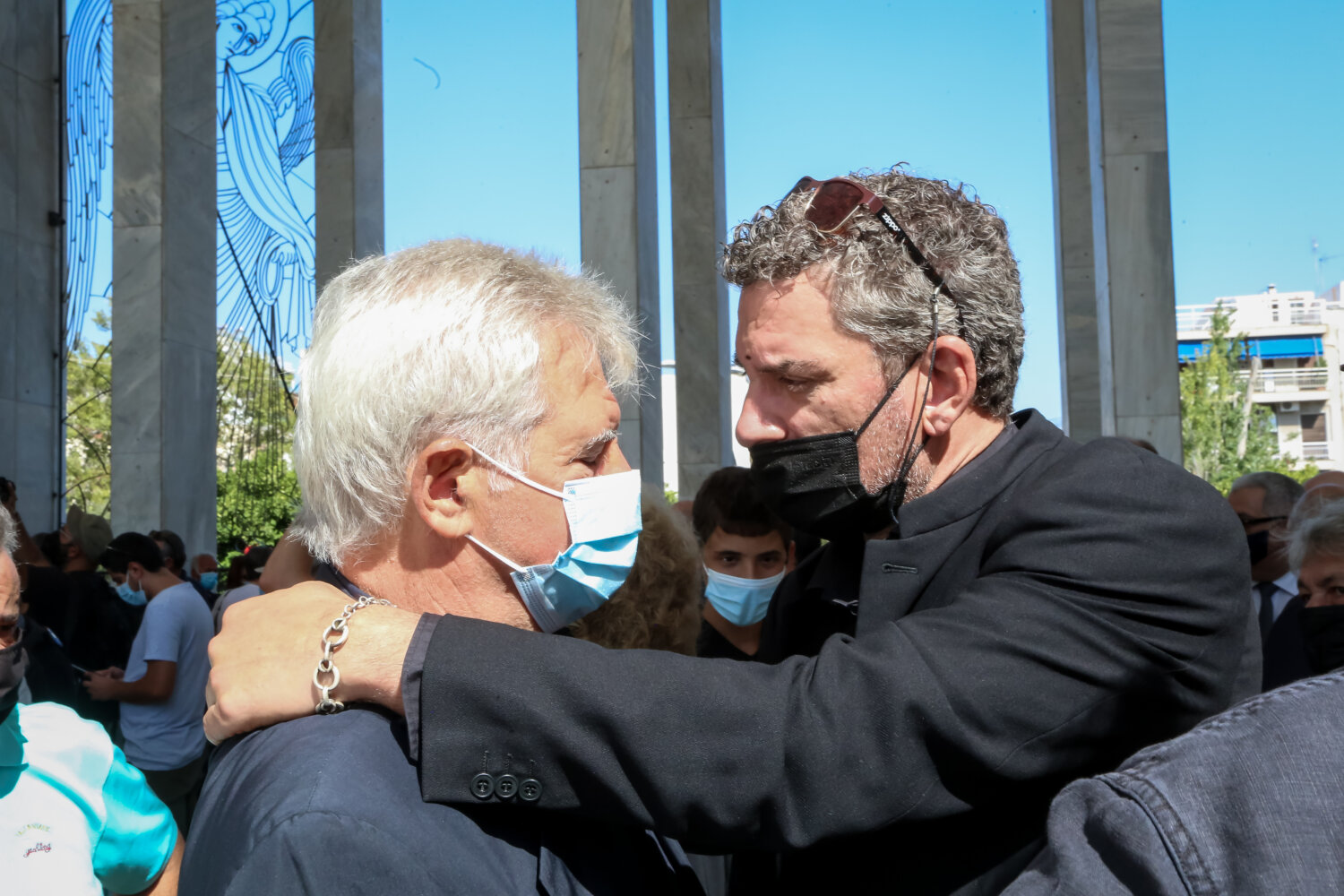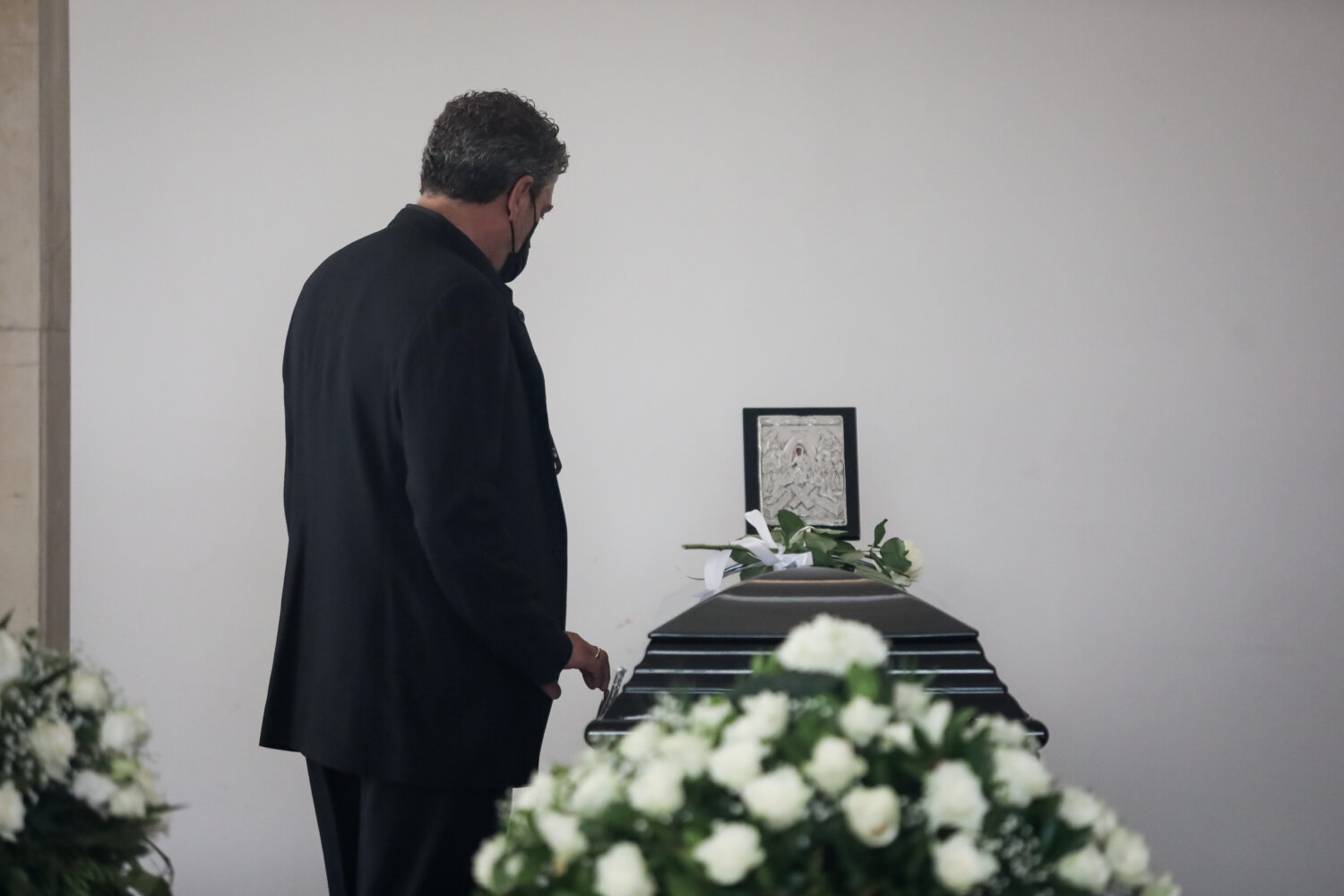 Συντετριμμένη η σύζυγός του Βίκυ Σταμάτη, η οποία λύγισε μπροστά στο φέρετρο, το οποίο καλύφθηκε με την ελληνική σημαία, αλλά και με αυτή του ΠΑΣΟΚ.