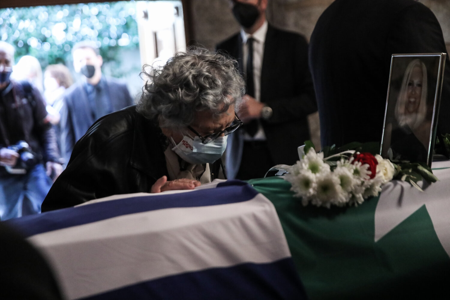 Πάνω στο φέρετρο της Φώφης Γεννηματά βρίσκεται η Ελληνική σημαία, η σημαία του ΠΑΣΟΚ και του Κινήματος Αλλαγής.