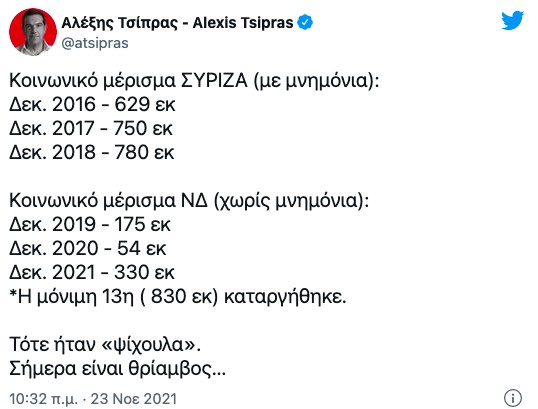 Στη σύγκριση του κοινωνικού μερίσματος που έδωσε ο ΣΥΡΙΖΑ και σ' αυτό της κυβέρνησης της ΝΔ προέβη ο Αλέξης Τσίπρας με ανάρτησή του.