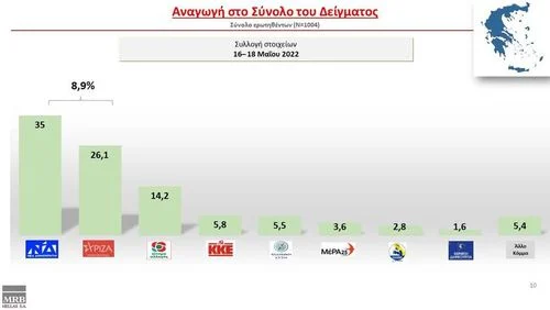 Σε ό,τι αφορά στην πρόθεση ψήφου με αναγωγή, η Νέα Δημοκρατία καταγράφει ποσοστό 35% έναντι 26,1% του ΣΥΡΙΖΑ, με τη διαφορά να διαμορφώνεται στο 8,9%, σύμφωνα με τη δημοσκόπηση για λογαριασμό του Newsbomb.gr.