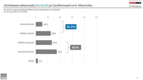Αναφορικά με την αξιολόγηση της κυβερνητικής θητείας με πρωθυπουργό τον Κυριάκο Μητσοτάκη, το 61% την κρίνει αρνητικά/μάλλον αρνητικά και θετικά/μάλλον θετικά το 35,5%.