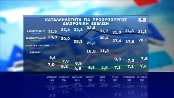 Για το ποιος είναι καταλληλότερος πρωθυπουργός το 28,1% απαντά Κυριάκος Μητσοτάκης, το 7,9% Ζωή Κωνσταντοπούλου, το 7,8% Νίκος Ανδρουλάκης και το 7,5% Κυριάκος Βελόπουλος. Προηγείται ο κανένας με 31,3%