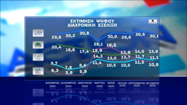 Ισχυρό προβάδισμα 16,3 μονάδων στην εκτίμηση ψήφου δίνει στη Νέα Δημοκρατία έναντι του ΠΑΣΟΚ η έρευνα Οκτωβρίου της Opinion Poll που παρουσιάστηκε στο κεντρικό δελτίο του Action 24. Τα δύο πρώτα κόμματα εμφανίζουν οριακή πτώση σε σχέση με την προηγούμενη μέτρηση της εταιρείας- 0,4 της μονάδας χάνει ΝΔ που καταγράφεται στο 30,1% και 0,2 το ΠΑΣΟΚ, που πέφτει στο 13,8%.