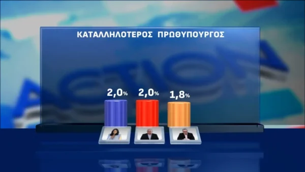 Για το ποιος είναι καταλληλότερος πρωθυπουργός το 28,1% απαντά Κυριάκος Μητσοτάκης, το 7,9% Ζωή Κωνσταντοπούλου, το 7,8% Νίκος Ανδρουλάκης και το 7,5% Κυριάκος Βελόπουλος. Προηγείται ο κανένας με 31,3%