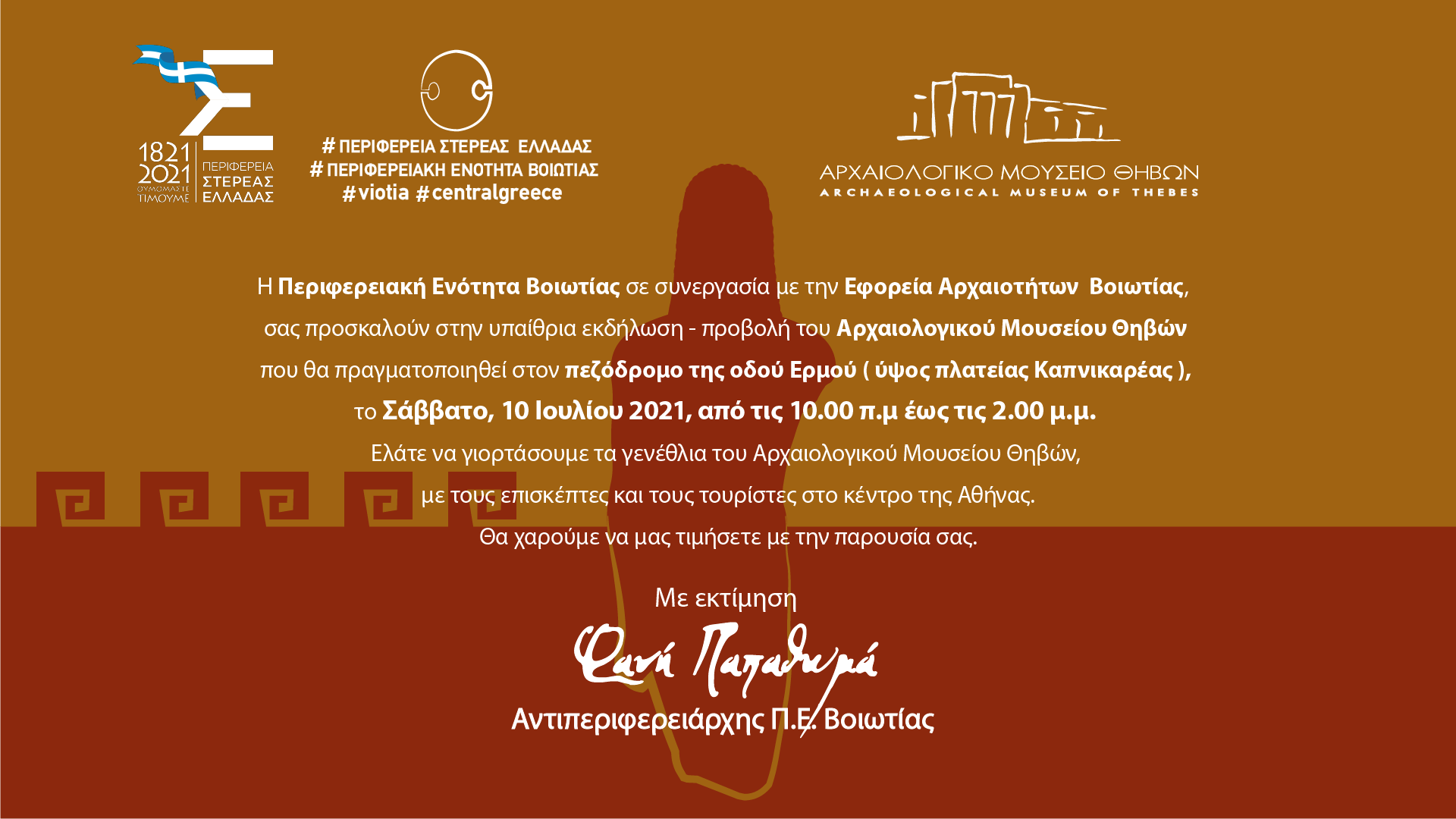Η Περιφέρεια Στερεάς Ελλάδας - Περιφερειακή Ενότητα Βοιωτίας, σε συνεργασία με την Εφορεία Αρχαιοτήτων Βοιωτίας και με αφορμή την επέτειο των πέντε χρόνων λειτουργίας του Αρχαιολογικού Μουσείου Θηβών, διοργανώνουν υπαίθρια εκδήλωση - προβολή, το Σάββατο, 10 Ιουλίου 2021, στον πεζόδρομο της οδού Ερμού στο κέντρο της Αθήνας.